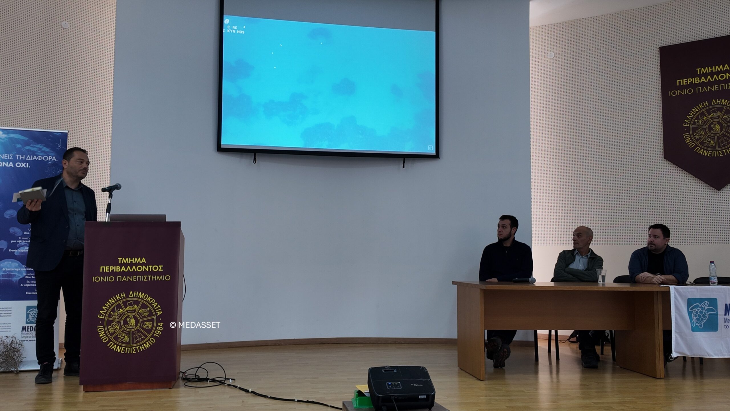 Κεντρικοί ομιλητές της εκδήλωσης ήταν οι Δρ. Νίκος Σημαντήρης (MEDASSET- Μεσογειακός Σύνδεσμος για τη Σωτηρία των Θαλάσσιων Χελωνών), κ. Νίκος Καρατζάς (AquaTec Diver Training) και Δρ. Βασίλης Γεροβασιλείου (Τμήμα Περιβάλλοντος, Ιόνιο Πανεπιστήμιο), ενώ τη συζήτηση συντόνισε ο Δρ. Γεώργιος Καρρής (Αναπληρωτής Καθηγητής του Τμήματος Περιβάλλοντος του Ιονίου Πανεπιστημίου).